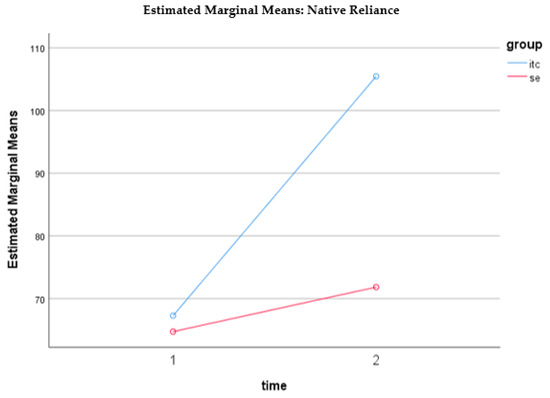 The mean score for cultural identity measured by the Native-Reliance questionnaire for the SE participants at pre-intervention (baseline) was 64.72 (SD = 14.054). The mean score for the SE participants at post-intervention was 71.82 (SD = 7.984). The mean scores for the UTC participants at pre-intervention (baseline) 67.26 (SD = 10.069) and at post-intervention was 105.44 (SD = 7.984). Both the within- and between-subject effects were significant. There was also a significant interaction between time and group. As displayed in Figure 2, at baseline (time 1), the two groups’ Native-Reliance scores were not significantly different (t = 1.039, p = 0.301). At post intervention (time 2), the UTC had a much higher Native-Reliance score than SE (t = 21.101, p < 0.001). For both groups, the Native-Reliance scores increased over time from pre to post. However, the UTC group (t = 19.888, p < 0.001) had a larger increase than the SE group (t = 4.248, p < 0.001).