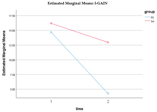 The mean score related to drug use interest measured by the Indigenous—Global Assessment of Individual Needs (I-GAIN) for the SE participants at pre-intervention (baseline) was 16.2000 (SD = 10.63111) and the mean score for the UTC participants at pre-intervention (baseline) was 14.7000 (SD = 7.59498). The mean score for the SE participants at post-intervention was 12.9600 (SD = 7.92815) and the mean score for the UTC participants at post-intervention was 4.2800 (SD = 4.69494). Both the within- and between-subject effects were significant. There was also a significant interaction between time and group. As displayed in Figure 3, at baseline (time 1), the two groups’ I-GAIN scores were not significantly different (t = 0.812, p = 0.419). At post-intervention (time 2), UTC had a much lower score than SE (t = −6.661, p < 0.001). For both groups, the I-GAIN scores decreased over time from pre to post. However, the UTC group (t = −16.180, p < 0.001) had a larger decrease than the SE group (t = −5.484, p < 0.001).