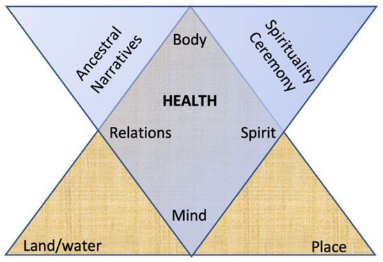 Meanwhile, the land/water, body, and place are critical elements involved in land-based healing and are symbolized within the bottom large triangle that forms the base of health. Each reside within one foundational angle as they interact reciprocally, in balance, and represent locations where embodiment of trauma and ancestral love and healing can occur. The two upper triangles—not overlapping—are symbols of the ancestral narratives and the spiritual ceremonies that facilitate changes and support transformation of trauma to resilience, or transcendence. For example, in our study, UHN women initially perceived place from historically traumatic, colonial views. However once strengths-based ancestral narratives of place were learned in relationship with land and water, the women initiated a spiritual response, often in the form spiritual ceremonies, spurring transformation and healing. While the body engages upon the land, the spirit further interacts with relations (both human and more than human), simultaneously eliciting mindfulness/contemplative practices.