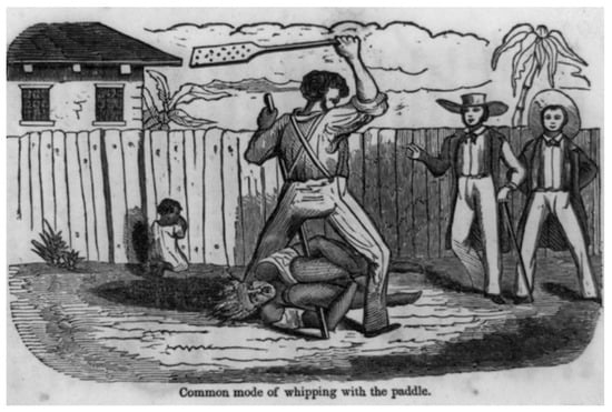Common mode of whipping with the paddle. “Paddling a Slave, U.S. South, 1845” Slavery Images: A Visual Record of the African Slave Trade and Slave Life in the Early African Diaspora, accessed 31 July 2020, http://slaveryimages.org/s/slaveryimages/item/1255.