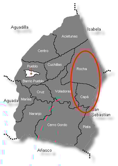 Municipality of Moca, Puerto Rico. The hacienda of the Lassalle family was located on the border between Barrios Rocha and Capa, as indicated by the oval. Map adapted from Boricua online.com.