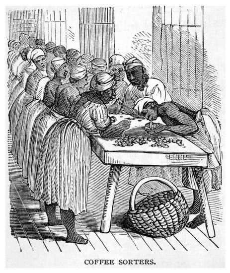 Leoncia Lasalle mentioned being enslaved on a Lasalle plantation in Moca, which was a cafetalera, a site devoted to raising coffee, and was later devoted to sugar; women and children were involved in the early phase of planting sugarcane. Work arrangements on coffee plantations were different than on sugar plantations in terms of the schedule of planting and harvest, with many duties undertaken by female labor. Coffee picking was seasonal work that lasted two or three months. Distant haciendas built cuarteles de peones or barracones, buildings that both housed and locked in laborers overnight. The bean was processed to strip it of its shell, fermented, and dried, then roasted, bagged, and carried off to market. Over time, each phase of coffee production went from processing by hand to some form of mechanization. See Figure 5 and Figure 6.