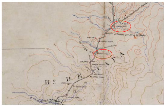 Map of Barrio Capa, Moca: in this 1901 military map, the oval annotations indicate locations of haciendas for 2 Lasalle descendants, Juan Bta. Lassalle and Donato Lasalle, a century after their ancestor originally established a coffee plantation there. Num. 22 Mapa Militar de la Isla, Comision topographico 1889, Itinerario: San Sebastian a Moca, 1901. ADNPR.net.