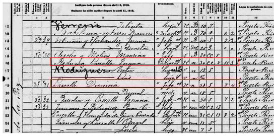 Households of Juana Rodriguez Lassalle, Line 16, and Dionicia [Leoncia] Lassalle, Line 19. Calle de la Paz, Barrio Pueblo, Moca, 1910 US Federal Census. United States Census, 1910, database with images, FamilySearch (https://familysearch.org/ark:/61903/1:1:VWKB-4H3: accessed 15 January 2020), Luis Rodriguez in household of Mauricio Arocho Y Matías, Moca, Moca, Puerto Rico; citing enumeration district (ED) ED 336, sheet 3A, family 30, NARA microfilm publication T624 (Washington D.C.: National Archives and Records Administration, 1982), roll 1772; FHL microfilm 1,375,785.