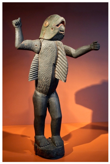 In the Kingdom of Benin, located in what is now Nigeria, African-made ivories and bronze castings depict Portuguese merchants among the agencies emanating from the water, associated with the god Olokun, “ruler of the seas and provider of earthly wealth”, and the imagery of these foreign traders appeared on royal art, including brass plaques, bracelets, and masks, alongside the “denizens of Olokun’s world (mudfish, crocodile, pythons, and the like) … and royal figures of the Benin court. The image of the Portuguese thus, became an integral part of a visual vocabulary of power and wealth” emanating from the seas (Ben-Amos 1995, p. 37). See Figure 8.