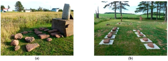 Sim’s Field is a simple circular cemetery surrounded by a low earth boundary wall and contains five headstones. The earliest headstone commemorates a death in 1816 and the cemetery is said to span the period from 1816 to 1843 (PEIGS 2000b). However, it should not be assumed that the 1816 headstone marks the establishment of the cemetery. There are a number of simple stone gravemarkers with no inscriptions which were considered by Cousins to mark the burials of members of the early Quakers of New London (Cousins 2016, p. 157). Support for his suggestion comes from the documents concerning a dispute over a right of way which led to the production of a report and map in 1811. These documents referred to an “old Burying place” which had been “used by the Inhabitants until within these few Years” (Stewart 1983, p. 16). It would appear that the inscribed gravemarkers represent a period of re-use. There is also evidence that the cemetery has been remodeled in the past. The earliest headstone refers to the “mound” containing the remains of William Mackay and his wife but the cemetery is now quite flat. The transcript of the cemetery, which incorporates information gathered in 1939, also refers to the marks of two full-length graves and one short one. These graves, too, are no longer evident. Sim’s Field Cemetery became overgrown but was cleared in 1971 and was declared a memorial during the Island’s centennial year in 1973 (Stewart 1983). More recently, however, the simple stone gravemarkers with no inscriptions were uplifted and placed on concrete paving slabs. It is unfortunate that some of the significance of the site has been lost. See Figure 1a,b.