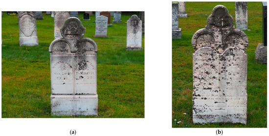 Gravemarkers at Sim’s Field Cemetery: (a) 2016 and (b) 2017.