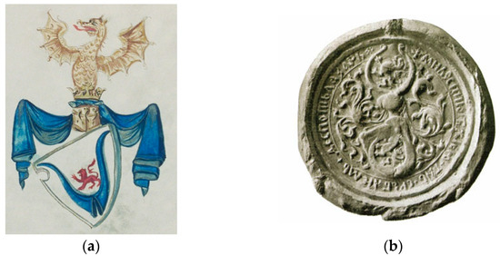 Another ruler after the disintegration of Dushan’s Empire, situated north of Volkashin, was Vuk Brankovic, who in 1377 captured Skopje from King Marko. Brankovic’s family coat of arms is found in the Illyrian armorials with a lion between two horns (Figure 4a). The same motif is found on a seal of Vuk Brankovic, depicting an entire coat of arms, with a shield, helmet and crest (Figure 4b). The shield depicts a lion between two horns, a motif repeated on the crest (Ивaнишeвић 2004, p. 227).