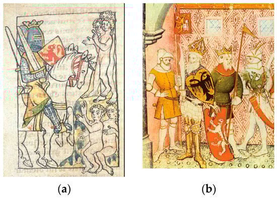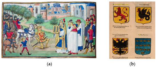 The first arms attributed to Alexander the Great appeared in the early 13th century (perhaps 1210) in the work of Roger IV of Lille, Histoire ancienne jusqu’à César, and in its illustrated version, the manuscript of Dijon (Cesar 1260). In it, Alexander’s coat of arms is Gules a lion Argent; in the general history of Lambertus de Sancto Audomaro, Liber Floridus (de Audomaro 1250–1270, p. 71v), Argent a lion Gules. The same blazon is found several times in the illustrated manuscript of the 14th-century novel by Thomas de Kent Le roman de toute chevalerie by Jehan de Grise (Figure 5a) (de Kent 1338–1410). Selovski counts 29 illustrations with the blazon Or a lion Gules, and in three Gules a lion Or (Ceлoвcки 2016). These crossed over into the coats of arms of Macedonia, as discussed later.