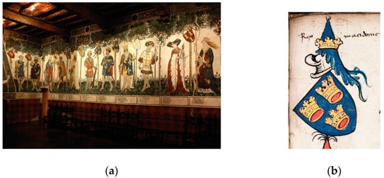 Coats of arms and armorial flags of the Nine Worthies can be found in stone, frescoes, tapestries, etc.; often the coats of arms show some inconsistency, sometimes transposed with each other. The three “Good Pagans”: Hector, Julius Caesar, and Alexander are shown on a wool tapestry from southern Holland from about 1380. The blazon for Alexander’s arms is a Gules a lion Or holding a long battle axe [(Nine Worthies Tapestry n.d.)]. A similar blazon appears in Le Chevalier Errant by Thomas III of Saluzzo, 1394 (Figure 5b) (Saluzzo 1394, p. 125r). In other arms, the axe is replaced by a halberd and sometimes the colors are inverted.