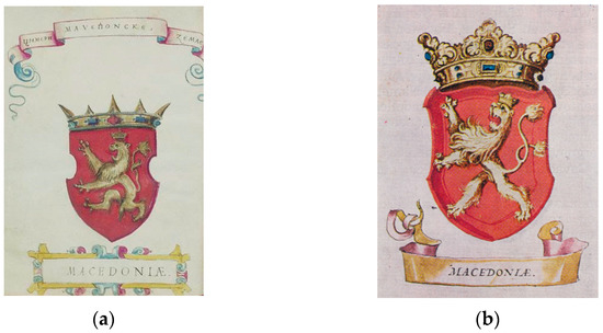 In the Althan Armorial of 1614, held by the University Library in Bologna, the Macedonian land arms are shown: Gules a lion Or crowned queued forchée. For the first time, the lion has a queue forchée. The shield is of the style called “Gothic” in Macedonian heraldic dictionary. Above is the text: “Maкeдoнcкe зeмлe чимepи” (Makedonske zemle chimeri, the arms of the Macedonian land) (Maткoвcки 1970, p. 87). Very similar is the Belgrade Armorial II from 1620 (Figure 10b). The Macedonian land coat of arms contained in it is on a Renaissance shield. Similar is Marko Skorojevic’s Armorial of 1636–1638.