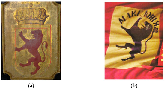 The Macedonian coat of arms is Or a lion Gules (Figure 11a). The lion is uncrowned and has a single tail. The shield is crowned with an arched ducal crown. Above the arms “Macedonia” is written, and below are the following Latin verses: