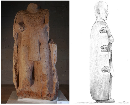 One can also see the union between power, status, and serpents on Laguna de los Cerros Monument 19 (LCM-19). LCM-19, a sculpture carved in the round Olmec style (Figure 4), depicts a male figure standing in an upright position with his arms crossed. He wears an elaborate belt and an elongated cape that surpasses the knees. The cape is an early hallmark of the Quetzalcoatl tradition, and, in this case, it has three serpent heads carved on its right side. The person(s) that carved the serpents did so in a style distinct to the Early Formative period, found on the pottery of San Lorenzo and at the site of Tlatilco. Based on the large amount of basalt found at Laguna de los Cerros and its surrounding cites, archaeologists believe it served as an important administration and basalt-carving center between the larger San Lorenzo and the key Olmec sites of Las Limas, La Venta, and Tres Zapotes. The unknown identity of the person embodied on LCM-19 is a question of interest and is necessary to understanding the relationships between people of status and commoners during the Formative period. Specifically, we highlight here the shared clothing styles seen on SLM-47, LVM-19, and the LCM-19 monument. Fajas, capas, y serpientes (belts, capes, and serpents) dominate the dress of Quetzalcoatl. In Garcia (2011), the first author noted that Susan Gillespie (2008) also pointed out the relationship between “bird-serpents” and men of status carved on monuments from Guerrero and Chalcatzingo, which are key sites and regions outside of the Olmec Heartland. One of these, but not the only one, the San Miguel Amuco Stela, shows a male figure wearing a bird-mask, a long cape, and both holding with his arms and carrying on his back bundles of feathers. The imagery of LCM-19, again, we believe, shows the role of serpents in their ability to legitimize divine status, medicine, and authority.