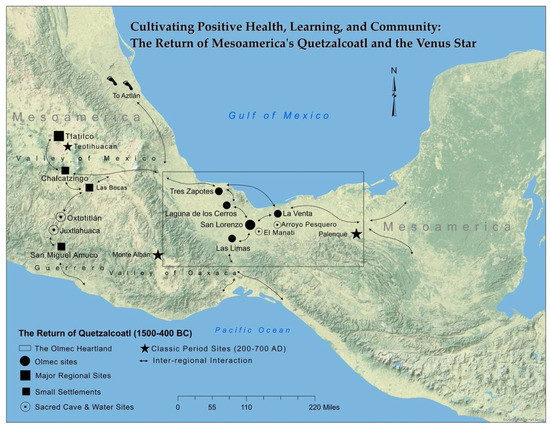 During the Formative period (1500–400 BC) the return of Quetzalcoatl involved a multi-regional network of wing-serpents, accountabilities, and the exchange of medicine. Best described as a healthcare movement, through inter-regional interaction people exchanged an assortment of portable and precious objects. Taking advantage of archaic trading routes, they effectively traveled prolonged periods and fulfilled local and regional responsibilities. Along the way, they left offerings at sacred sites, hunted for survival, and gained a keen understanding of the land and cosmology. Quetzalcoatl, in the role of medicine man, artisan, and custodian of the land, offered spiritual guidance, comfort, and traditional healing ways. This story informs all Indigenous peoples of the Americas. Regional map showing corridors of human interaction created by 1st author using ArchMap™.