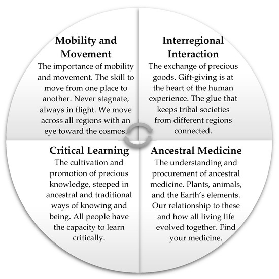 These values and insights—the ritual and ceremonial knowledge that we write about in this paper—inherently fall under the care of the Indigenous Xicanx community, and relevant Native groups. By not embracing sacred knowledge now, we lose it forever, further undermining our health, and well-being. These provide: (1) critical learning content required to build individual aptitude; (2) an understanding of mobility and movement to sustain keen knowledge of the land and cosmos; (3) the benefits of interregional interaction (carrying cargo responsibilities); and (4) real-life thought and practice concerning ancestral medicines. We refer to these four values as the Wheel of Quetzalcoatl (Figure 9). They stand for the nuances of an Indigenous education that sustain culture in the home, in the community, and in schools, outside of monocultural norms of achievement (Paris and Alim 2014). To aid learners with problems beyond the classroom, one can recite narratives of the ancient past, share personal stories, draw from metaphors, and explain the potential for peace, new meaning, and how to reconcile. When in need, our ancestors may be summoned for help, and both teachers and students can expect a response. Such as with the feathered serpent, many of us embody an array of feminine and masculine energies, anatomies, and expressions. Such keen ways allow us the ability to contact our ancestors in the spirit world and to talk with animal relatives. For an in-depth read concerning the fluidity of gender, and the complementary feminine and masculine energies in the realm of healing, and medicine, see Medina and Gonzales (2019). At times, the prescription of plant medicine surfaces in a safe way. Only the fire is above us, under the stars we are all one, and no one’s pain is greater than anyone else’s. These values and insights serve the Xicana/o/x community in regaining a grip on their healthcare and on who they are.