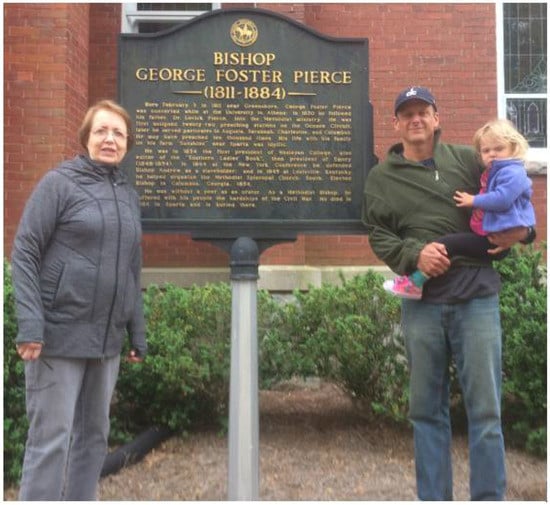 In the book my mother had left out on that living room table, I discovered that Pierce and his family were not only slaveholders, but prominent public defenders of slavery in the Methodist Episcopal Church, South (MEC, South). (In this article “slaveholders” and “slaveholding” are terms that refer to people, usually racialized as White, who have legal ownership over Black or Indigenous people’s bodies and their labor.) Wanting to learn more, I asked her to accompany me along with my (then) six-year-old son, Jasper, and (then) two-year-old daughter, Nitza, on a road trip to Hancock County. On the drive down, I asked my mother about Bishop Pierce and his memory within her maternal family. She described him as “a revered ancestor who was quite famous in his time for his work as a Methodist Bishop” who was “admired by his descendants” (Gorman 2018). No one had ever talked to her about our family enslaving people on a plantation; see Figure 2 and Figure 3.