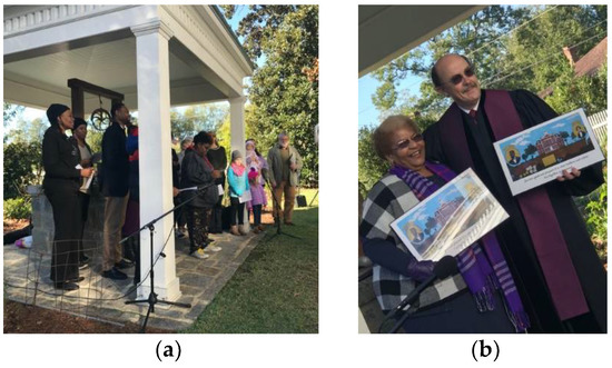 Figure 6. (a): Choir members of Holsey Memorial CME Church and Pierce Memorial United Methodist Church singing together at the Sunshine wedding re-enactment. (b): Reverend Gwendolyn Smith is pastor at Holsey Memorial CME Church in Sparta. Darrell McGinnis is pastor at Pierce Memorial United Methodist Church in Sparta. They are pictured together holding placards celebrating the wedding re-enactment event. Photographs courtesy of Reverend Gwendolyn Smith.