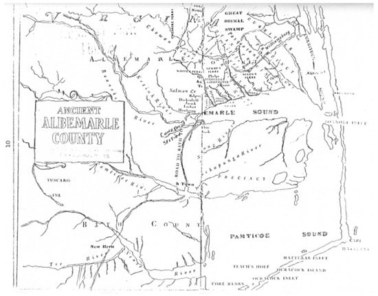 Map of colonial coastal northeastern Carolina where George Foster Pierce’s European ancestors settled. Map from (Pierce et al. 1980, p. 10).