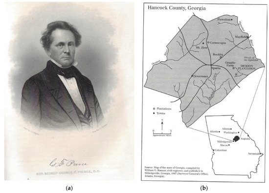 (a): Photograph of George Foster Pierce from The Life and Times of George Foster Pierce, published in 1888. (b): Map of Nineteenth Century Middle Georgia including Greene and Hancock Counties where George Foster Pierce lived most of his life. Image courtesy of Pierce, McClurkin, and Pierce, publication year unknown. Public Domain.