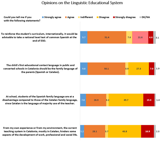 Distributions of preferences derived from several questions concerning the immersion linguistic educational system in Catalonia. There was significant agreement with the first statement, “To reinforce student’s curriculum, internationally, it would be advisable to take a national test of the Spanish language at the end of secondary education”, and also with the fourth statement, “The child’s first educational contact language in public and concerted schools in Catalonia should be the family language of the parents (Spanish or Catalan)”. In both cases, the support was above 60% in the entire population. Concerning the second and third statements, the degree of support was about 33%, although several differences were observed after dividing the population into segments. ESO: compulsory secondary education.