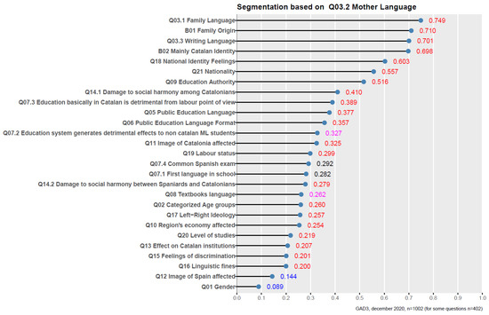 Differences among Catalonians depending on the “mother language” segmentation in Table 3. The variables are sorted by their C values. The different colours of the figures correspond to p-values that are less than 0.001 (red), between 0.001 and 0.01 (magenta), between 0.01 and 0.05 (black), or just over 0.05 (blue).