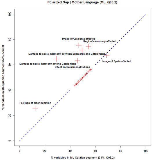“Polarized gap” plot distinguishing between participants with different mother languages (Q03.2) in relation to some relevant variables. The surveyed population was segmented into two large groups according to their mother language—Catalan or Spanish. Each variable is depicted by a red cross. The further each variable is from the bisector of the figure, the more diverse the opinions of both groups regarding it are. Thus, for the variable “damage to social harmony among Catalonians”, the group with Spanish as their mother tongue agreed in 65% of the cases, compared to 29% in the group whose mother tongue was Catalan.
