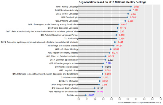 We were interested in finding the variables that were most associated with “feelings of national identity”. In our first analysis of the described dataset, we focused on the marginal stochastic dependence of several linguistic and political variables (the 26 variables of the survey plus another 2 built on transformations of these) on “feelings of national identity” in the form of the six abovementioned categories. With this and the other 28 variables, we made a contingency table, which allowed us to calculate a standard chi-square test, , based on a weighted sample, its p-value, and a standardized contingent Pearson coefficient, C. The results for the dependence of the studied variables on feelings of national identity are presented in Table 4 and Figure 4.