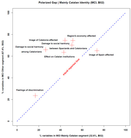 “Polarized gap” plot showing the most relevant differences distinguishing participants self-identifying as “mainly Catalan” with respect to the other “feelings of national identity” via several variables. The population was segmented into two groups according to their feelings of national identity: “mainly Catalan identity” (responders with either “only Catalan” or “more Catalan than Spanish” identities) versus the opposite segment. Each variable is represented by a red cross. The further each variable is from the bisector of the figure, the more different the opinions that each group had with respect to it. Thus, for the variable “damage to social harmony among Catalonians”, the “mainly Catalan identity”’ group agreed in 26.4% of the cases, compared to 65.9% in the group with other feelings of national identity.