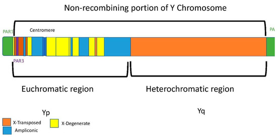 The Y chromosome is a small acrocentric chromosome (Skaletsky et al. 2003). Two types of regions can be distinguished in this chromosome, fundamentally: non-recombinant region and pseudoautosomal region (PAR1 and PAR2) (Figure 3).