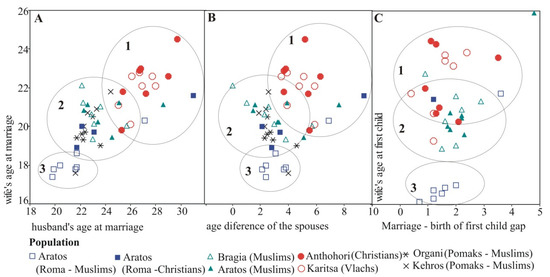 In addition, despite the partial overlapping observed in some of the marriage cohorts, age distributions at marriage of males and females clearly formulate three distinct groups as seen in the scatterplot of Figure 2A. The most discrete between them is the Roma case (Figure 2A, 3). The intermediate group consists of the Muslim populations (Figure 2A, 2) and the last one of the Christians (Figure 2A, 1). The same classification is observed concerning the age of the bride and her age difference with the groom (Figure 2B), where a general tendency for greater differences is found in the Christian populations.
