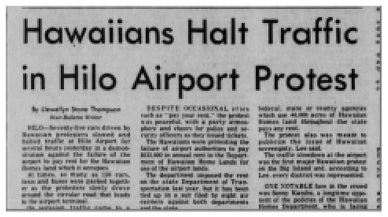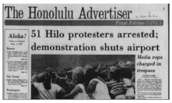 - Stone, Llewellyn. 1978a. Hawaiians halt traffic in Hilo Airport Protest. Honolulu Star-Bulletin. July 5. Available online: https://www.newspapers.com/image/272025158/?terms=Hilo%2BAirport%2Bprotest (accessed on 6 November 2021).