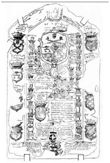 To answer this question, the chronology of the occurrence of Illyrian heraldry and the content of Illyrian Armorials should be followed. There are several dates in that chronology. The first of these dates is 6 May 1584, when Don Pedro Ohmuchevich received a confirmation, respectively a genealogical plate, from the Bosnian bishop Antun Matei (Maткoвcки 1990, p. 48), known in heraldic science as Rodoslovlje gospode Srpske i Bosanske (Пaлaвecтpa 2010, p. 57) (Figure 5).