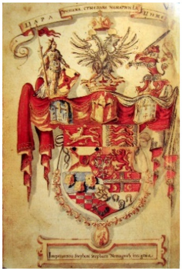 If one accepts the theory of A. Solovyev that there is a lost Ohmuchevich’s armorial, which was finally prepared around 1590, then we should check the possibility of Capaccio using that armorial or other of Ohmuchevich’s documents as sources for his work. Given the year of the correspondence indicated between the two, this, of course, is possible. However, it is not then clear why Capaccio mentions a blazon for the crest of Stefan Nemanjich as follows: il Leon nero con tre sbarre d’argento con la spada cimiero di Stefano d’Ilyria, or “a black lion with three silver belts with sword, the crest of Stefan of Illyria” (Capaccio 1592, II 11) (Figure 8). All other examples that Capaccio mentions are coats of arms. On the other hand, he does not mention Kotromanich’s coat of arms, which also displays a lion. Of course, the use of the term cimiero is symptomatic; it means crest in Italian. According to Matkovski, in Hungarian this word means coat of arms (Maткoвcки 1990, p. 37). Goodall says the Hungarian influence on Illyrian heraldry is also reflected in the fact that the word cimer, which in French means crest, and, in Hungarian, coat of arms, is used in the Illyrian armorial. Finally, there is also the question of why Capaccio decided to change the color of the lion from the crest if he changed it at all. Specifically, from all the colored armorials that we have available, none have Capaccio’s colors in the blazon for the crest. It must be mentioned that Nemanjich’s coat of arms has a very stable and permanent blazon both in the Illyrian armorial and in the Stomatographies, read as gules, a two-headed eagle argent.