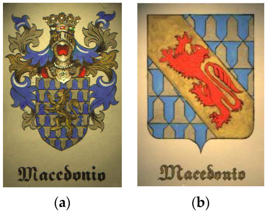 Additionally, a source for the Macedonian coat of arms can be found in the coat of arms of the Macedonio family from Naples. According to family tradition, this family originated in the dynasty of the Argeads or from Philip II through his daughter Thessalonica, but also in the Macedonian dynasty in Byzantium (Boйникoв 2011). The Macedonio family was first mentioned in sources in 1268. In the historical development of the family, two branches with two coats of arms formed. The older branch of the marquise of Oliveto carries a coat of arms with a blazon: Vair, Azure and Argent, a Lion Or (Petrasancta 1638, p. 312). The branch of the dukes of Campora carries a coat of arms with a blazon: Vair, Azure, and Argent, on a Bend Or a Lion passant Gules (Figure 14) The vair in the blazons of these coats of arms is somewhat reminiscent of the coat of arms of Macedonia from the Miltenberg armorial, where the blazon of the shield is: Vair, Gules and Argent, on fess Azure three crescents Or (Joнoвcки 2015, p. 152). It is obvious that the blazon of the older branch is close to the coat of arms of Macedonia from the Illyrian armorial. This is of great importance primarily for the origin of the Macedonian coat of arms because part of the family coats of arms in the Illyrian armorial are directly taken from, and in another part are based on, the example of coats of arms from contemporary Italian heraldry (Pyдић 2006, p. 55). The coats of arms of Balshich, Voinovich, Deskoevich, and probably others testify to this.