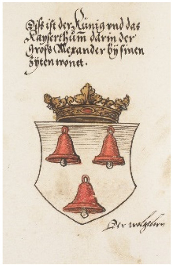 Aleksandar Matkovski was the most prominent early scholar to conduct in-depth research on the Macedonian coat of arms. However, the inability to explore the novels about Alexander the Great as well as a good part of European armorials, and probably the inappropriateness of the topic at the time that Matkovski was doing his research, would lead him to two narrow conclusions regarding the Macedonian coat of arms as a whole. The first one is that, unlike the other South Slavic coats of arms, it appears first on a domestic South Slavic terrain (Maткoвcки 1990, p. 43), and the second one is that the Macedonian coat of arms is stable and always a golden lion on a red field (Maткoвcки 1990, pp. 167–74). Such a basic set-up of the Macedonian heraldic science has finally been abandoned through several contemporary studies relating to the coat of arms of Macedonia such as Cимбoлитe нa Maкeдoниja by Jonovski. Today, it is certain that, despite the undoubted importance of Matkovski’s work, his conclusions regarding the appearance of the Macedonian coat of arms, as well as its blazon, are unsupported and cannot be accepted fully. As mentioned above, the coat of arms of the King of Macedonia was witnessed in 1448 (at least a century and a half before the appearance of the first Illyrian armorial) (Figure 4). In addition, the Macedonian coat of arms in Illyrian heraldry with red or gold lions is almost equally encountered in the sources, something that we will discuss in greater detail in this paper. However, regardless of the significant advancement in the understanding of the problem of the Macedonian coat of arms, the following questions remain unanswered. Where did the Macedonian coat of arms in Illyrian heraldry appear from, and what is its relation to the Macedonian coats of arms in European heraldry?