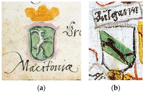 The first point of view is presented by the scholar A. Solovjev. According to him sometime between 1584 and 1594, and probably around 1590, Don Pedro Ohmuchevich, a Spanish admiral of Ragusian origin, created his own armorial in his efforts to obtain Spanish nobility. This armorial would become a sort of prototype, from which all other transcripts or armorials would later emerge (Solovjev 1954, p. 131). According to this point of view, the Korenich-Neorich armorial (Figure 2a) is the first transcript of the now-lost or hypothetical Ohmuchevich’s armorial sometimes called Illyrian Armorial. This is a widely accepted thesis, especially from researchers in Serbia. In addition to A. Solovjev, this view is shared by A. Palavestra and S. Rudic.