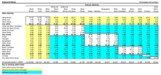 - Office for National Statistics. 2005. ‘Inter-ethnic marriages’ (and weblink to reference tables). In Focus on Ethnicity and Identity; London: ONS, p. 4. Available online: https://webarchive.nationalarchives.gov.uk/20160129234952/http://www.ons.gov.uk/ons/publications/re-reference-tables.html?edition=tcm%3A77-50846. (accessed on 1 July 2021).