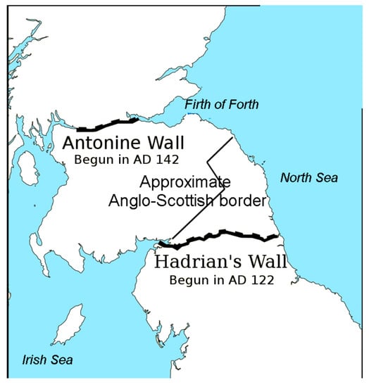 The position of the Antonine wall (wholly within Scotland), Hadrian’s Wall (wholly within England) and the approximate Scotland-England border (which changed at various times).