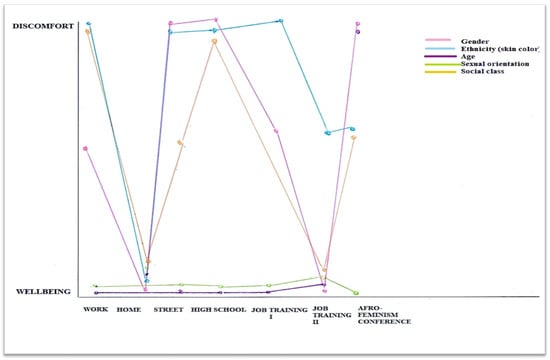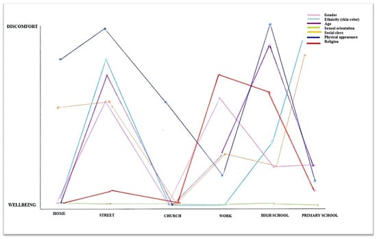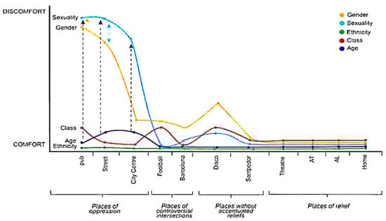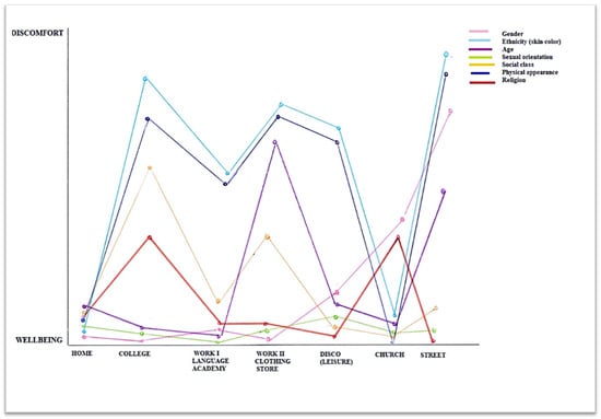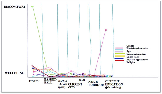 The (x) axis represents the geographical dimension of experience and includes different spaces or experiential locations (e.g., home, street, work, school). And the (y) axis corresponds to the psychological dimension of experience, in which the participant evaluates their experiences of comfort or discomfort according to different social variables or aspects of identity (e.g., gender, ethnicity, age, sexual orientation, social class, physical appearance, religion), each of which is differentiated by a distinct color in the legend of the graph. Intersectionality is represented through the interplay between all these dimensions of experience and the social and psychological variables at play.