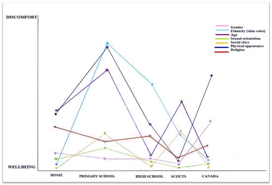 In the Relief Maps drawn by the participants of our study, we identified a systemic/systematic type of discomfort that reproduces a fairly similar pattern in all cases. Associated with the category of ethnicity/skin color, a heightened degree of discomfort was described by participants in their school experiences. Although this perception of discomfort may have varied among participants and may not have been uniform across all educational settings or at all academic stages (e.g., primary school, high school, college, etc.), in general, this axis—in theoretical terms and as visually indicated on the Relief Maps—stands out significantly, and it does so above all in places of education.
