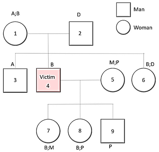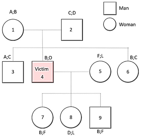 X-chromosome marker utility in armed conflicts or other mass disaster victim identifications. All letters (A, B, D, …) represent letters. In cases where genetic markers of the X-chromosome are analyzed, it is necessary to pay attention to the sex of the individuals, since the usefulness of this chromosome is directly related to its mode of transmission. All females have two X-chromosomes; each man has only one. Females 1 and 5 transmit their information to their offspring randomly. Individuals 2 and 4 only transmit their information to their daughters, and always the same information since they have only one X-chromosome. For the possible identification of victim 4, only individuals 1 (mother) and 7 and 8 (daughters) would be useful. Concerning individuals 3 and 6, they are not especially useful, since for each analyzed marker they could or could not share genetic information with their brother, the victim, depending on what they inherited from their mother. Source: Cláudia Gomes (2020), self-authored.