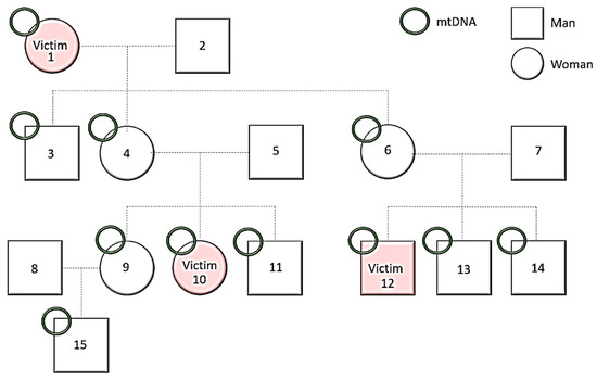 MtDNA utility in armed conflicts or other mass disaster victim identifications. Female 1 transmits to all her offspring (3, 4, and 6) a copy of her mtDNA, usually without any changes. Subsequently, her daughters (4 and 6) pass on to their offspring the same genetic information regarding mtDNA. In this way, individuals 1, 3, 4, 6, 9, 10, 11, 12, 13, 14, and 15 share the same mtDNA. Thus, to help in the victim identification process (1, 10, and 12), any of the previously mentioned individuals could be used, comparing their mtDNA information with the information obtained from the victim. However, if victims or human remains are observed together, for example, in a mass grave, it would not be possible to distinguish the three individuals from each other using only mtDNA information. Source: Cláudia Gomes (2020), self-authored.