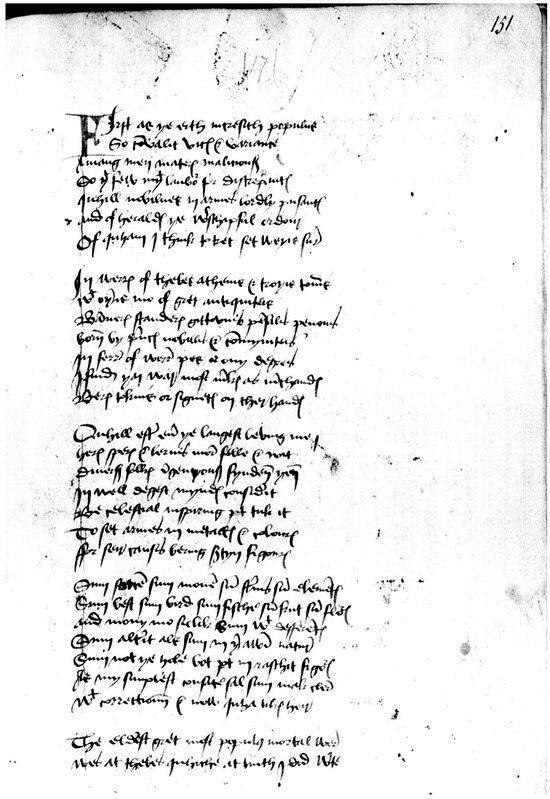 | First as the erth incresith populus, So convalit variance and vicis, Amang men materis maliciouse, So that few mycht laubour for discrepancies [discrepance], quhill nobilnes in armes, lordly pusancis, and of heraldis þe werschipful ordour, Of quham I think to tret [treit], set weyis sure. | Line 1 Stanza I | First as the earth increases populous, So grow discord and vices, And malicious matters among men, So that few work for distinctions, which nobleness in arms, lordly powers, which heralds, the worshipful order, Of whom I intend to treat, arrange. |