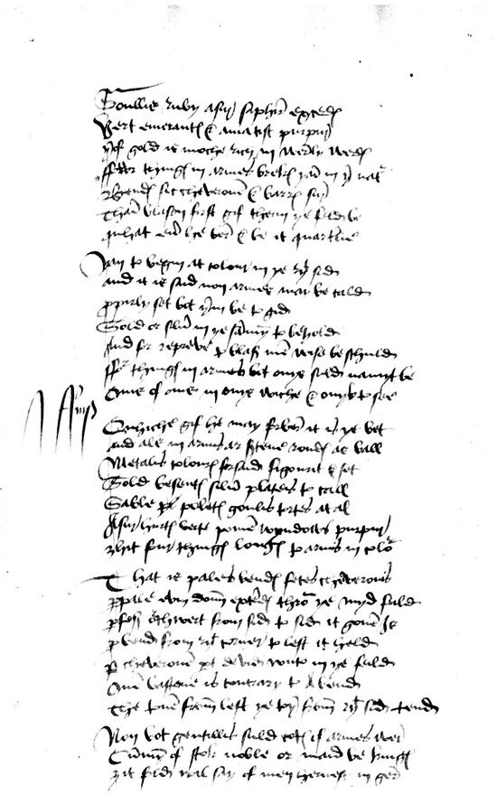 | Goullis, ruby; asur, saphire excedis Vert, emerautis; and amatist, purpur; therof gold is moche rich in werely [weirly] wedis. ffowr thingis in armes brekis thaim in ther nattur: Bendis, sic, cheveroune, and barris sure; Thaim blazon [blasoun] first, gif therin [þairin] the feld [field] be; quhat euer he bere [beir], and be it quarterlie. | 92 XIV | They exceed (in worth) Gules, ruby; Azure, sapphire Vert, emerald; and amethyst, Purpure; thereof gold is rich in warlike clothes. Four things in arms divide them in their nature: Bends, sic, chevron, and bars;20 Blazon these first, if they are in the field; whatever he bears, even if quarterly. |