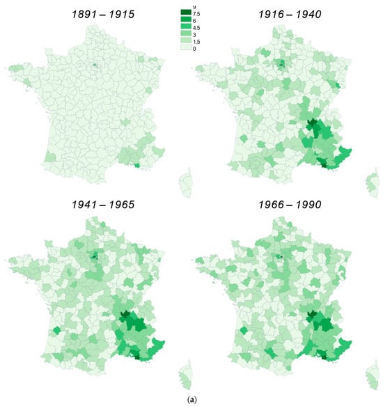 The first result is not really new. Coincidentally, the 1915 break in the INSEE data coincides with the first Armenian arrivals in France subsequent to the genocide. This is clearly reflected by the results in Table 1 and a comparison of the maps in Figure 1a,b for P1 (1891–1915) and P2 (1916–1940). Before 1915, the Armenian presence in France was significant only in Paris and Marseille. The value of f1,Paris is 40.28% for the ARM list, with 23 different surnames for 29 births, and 34.54% for the IAN list, with 146 different surnames for 220 births. For Marseille, the value of f1,Marseille is 8.3%, with 5 different surnames for 5 births for the ARM list, and 19.3% for the IAN list, with 63 different names for 101 births.