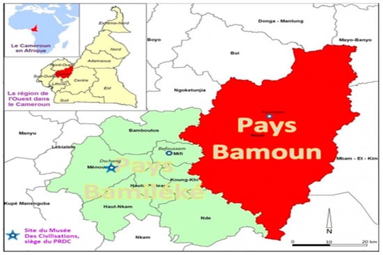 Location of the Bamum Kingdom in West Cameroon. Source: KAMDEM Pierre, “Le Programme de la Route Des Chefferies à Dschang: patrimonialisation, migrations et développement local dans les hautes terres de l’Ouest-Cameroun”, Espace populations sociétés [En ligne], 2017/3|2017, mis en ligne le 25 janvier 2018, in http://journals.openedition.org/eps/7289; DOI: https://doi.org/10.4000/eps.7289, consulted on 24 May 2021.