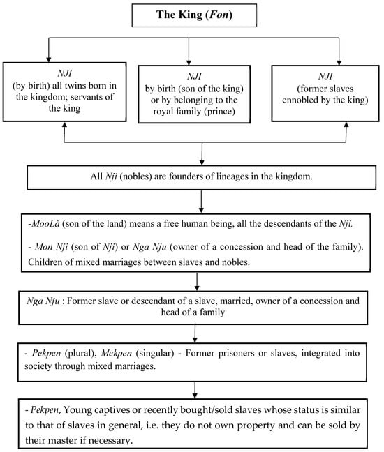 This territorial expansion was of undeniable economic importance, as the prisoners of war (captives) were used to exploit the vast areas acquired through the war, making the landowners and the majority of the Bamum as rich as possible (Njiassé-Njoya 1980, p. 160). In this vast kingdom, life was based on the principles of royalty and respect for customs (Tardits 1979, pp. 671–96). The new Bamum customary code, favoured the creation of a slavery society in which the nobles dominated and exploited the enslaved people. In any case, the hierarchical nature of Bamum society was an established fact. It was the fruit of a multi-faceted historical process. The building efforts of the various Bamum monarchs, committed to a logic of appeasement and fusion, had made it possible to arrive at this organisation. To better understand the organisation of Bamum society, it is useful to look at the table or the organisation chart below.