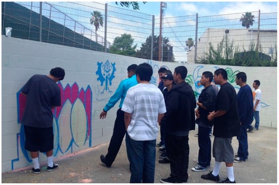 Students begin collectively painting a mural on the school campus. Here, a campus mentor is dialoguing with students to increase the empathy lenses of others whose lived experiences differ from their own. The photograph is from the authors’ personal collection.