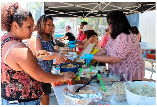 School staff serving food to families at potluck lunch during the ribbon-cutting ceremony. The photograph is from the authors’ personal collection.