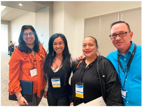 Navigational capital allows students to navigate multiple institutions (Yosso 2005). One example of encouraging navigational and social capital is the San Diego City College’s Program for Engaged Educational Resources (PEER), which is funded by the San Diego Housing Commission. The PEER program includes what is known to be the first higher education course on homelessness, developed alongside experts in homelessness prevention, social services, and policy, as well as academic counseling, career counseling, job seeking and job application assistance, coaching for resume building and interviewing skills, and partnerships with more than 30 organizations who hire students—many still working on their associate’s degrees in social work, alcohol and drug studies, gerontology, or psychology—to work in homelessness prevention. The program was formed by utilizing an understanding of systems theory and the need to integrate multiple departments, partners, and staff for a clear classroom-to-career path for students (Michailakis and Schirmer 2014). In Figure 11, a co-author is with three of the program’s alumni, who have experienced housing insecurity and other barriers as well. Because of the program’s wrap-around type of approach with education, career support, and external partnerships, these alum work in organizations that address homelessness. One alumni reported being able to secure their own apartment for the first time in many years. In Figure 12, another PEER alum shared their experiences with others during a housing conference in Southern California, in a county with one of the largest housing-insecure populations in the United States. By having students owning and sharing their lived experiences, they are able to utilize these parts of their identity to help further their educational and career goals. As Figure 12 shows, not only do students gain careers, they grow their capacity to be thought leaders and experts in the issues they feel are important.
